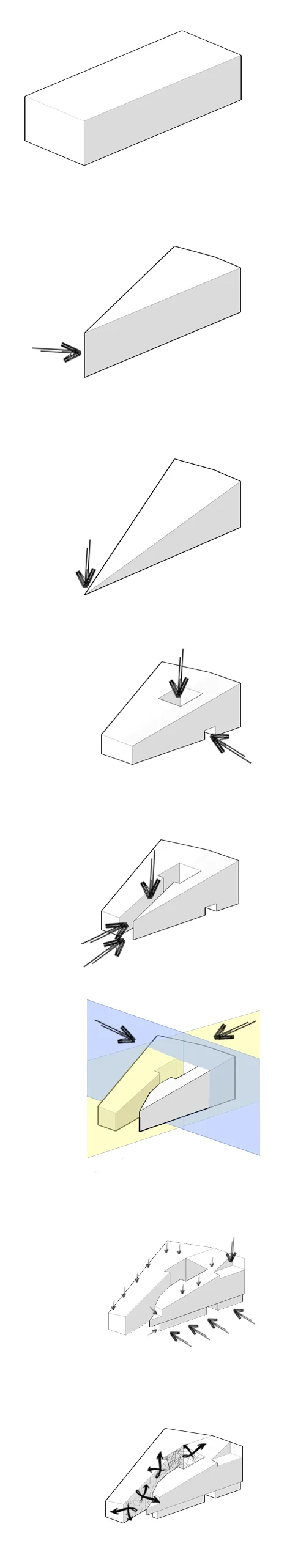 Our group, Alluvion, decided to modify the program and use the building as an educational opportunity for sustainable design that encompasses the exhibits on multiple stories with the materials lab/classrooms on a lower level. Much like the Guggenheim, the museum follows a linear path upwards following the process of water filtration process using a "living machine", an ecological sewage treatment process designed to mimic wetlands water filtration. The design also incorporates a "canyon" opening that funnels air in to a wind collection area, a separate sustainability lab, a green roof that was meant to build up from Mount Vernon Square and the green space out front, and blend in to the urban fabric of the proposed K Street corridor.